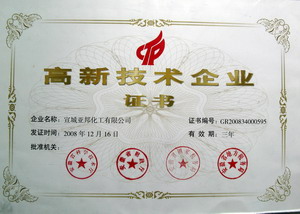 宣城亞邦化工有限公司幾年來一直堅持貫徹集團公司“人才為本、科技為先”的經營理念,技術上大膽創新,努力將科技成果轉化為生產力,提升企業的競爭力。繼08年申報了酞菁顏料生產中復合催化劑的發明^后,近日,該公司獲得了由安徽省科技廳頒發的^《高新技術企業證書》。